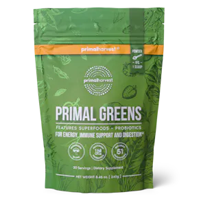 Primal Greens by Primal Harvest features over 50 fruits, vegetables, herbs, spices, and mushrooms, Primal Greens delivers tons of nutrients with just one scoop per day. It's sweetened with plant-derived sweetener and provides 2.4 g of dietary fiber, as well as 1 billion CFUS of probiotics.